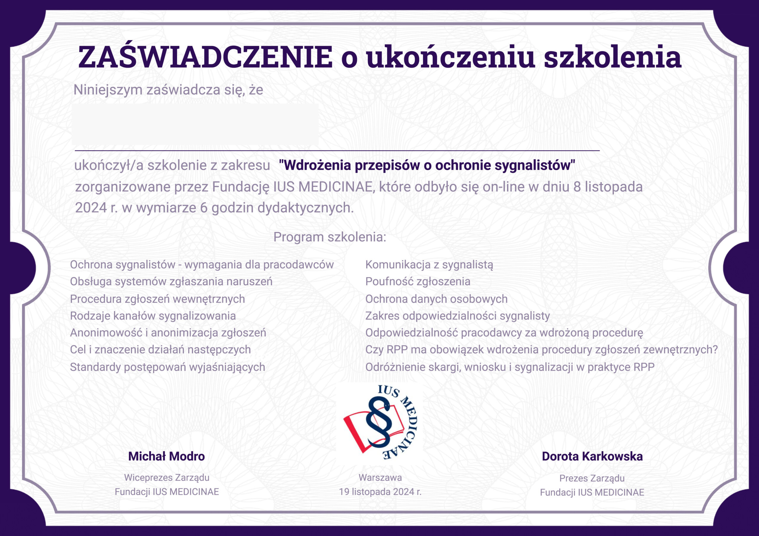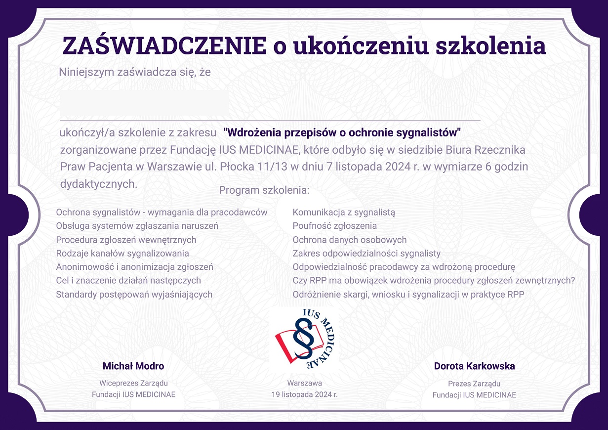 Fundacja Ius Medicinae przygotowała i przeprowadziła szkolenia z Wdrożenia Przepisów o Ochronie Sygnalistów. Odbyły się one w dniach 7 i 8 listopada 2024 roku stacjonarnie w siedzibie Biura Rzecznika Praw Pacjenta ul Płocka 11/13 oraz online za pośrednictwem platformy MS Teams.